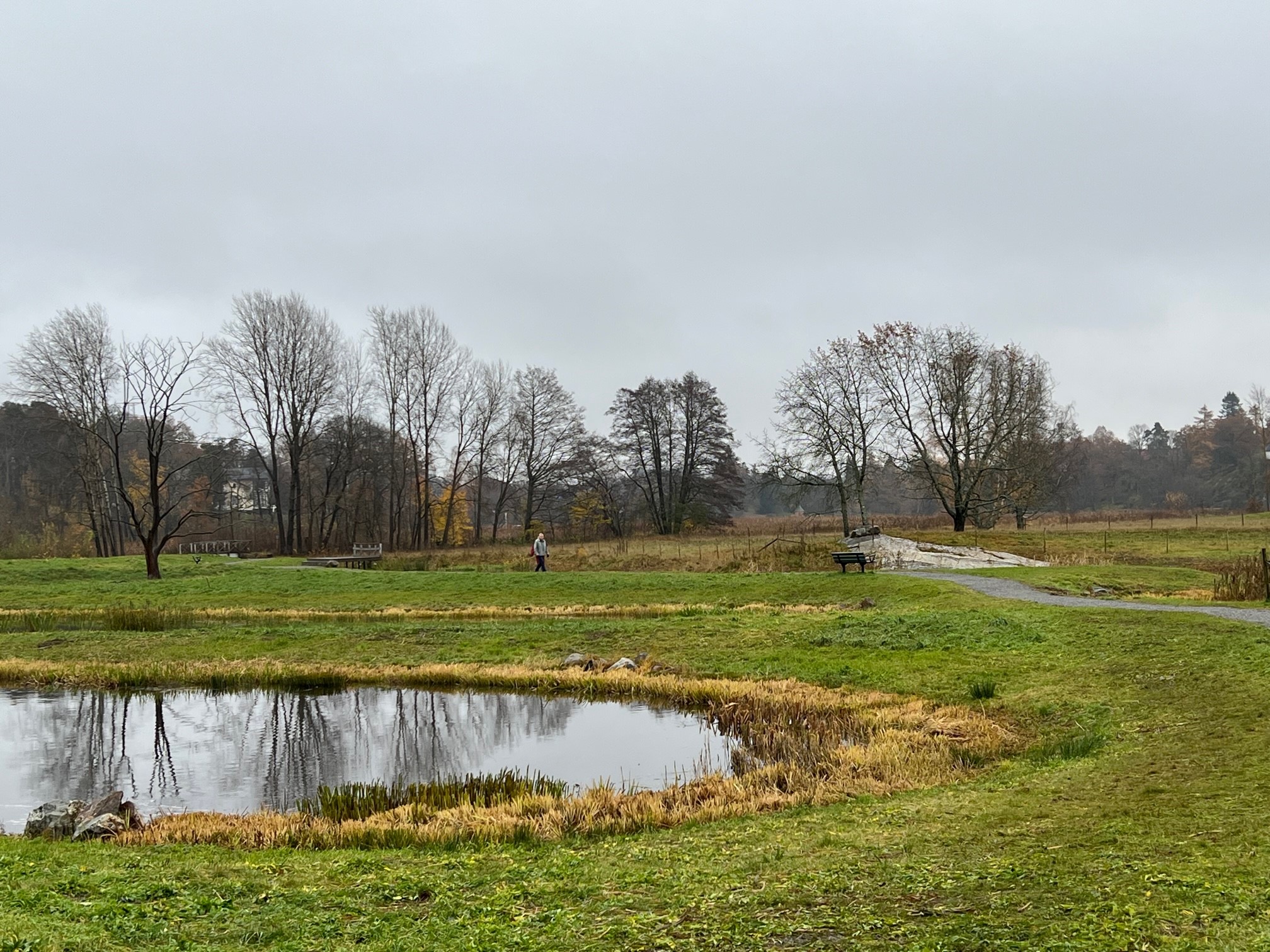 - Utformning: en grund och bred dagvattendamm med ca 2500 m² vattenyta. Dammen modellerades mjukt med flacka ständer.
