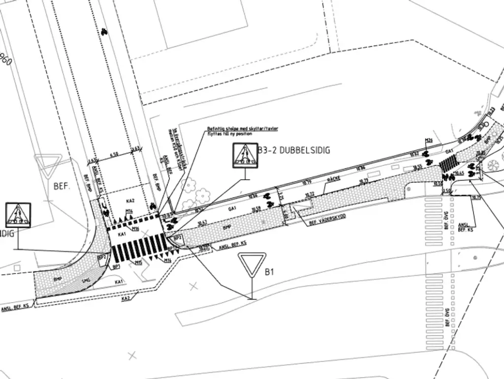 - Utformning: Två 1.5 meter breda cykelfält försedda med röd termoplast/beläggning vid känsliga korsningspunkter, samt en breddad och separerad cykelbana.